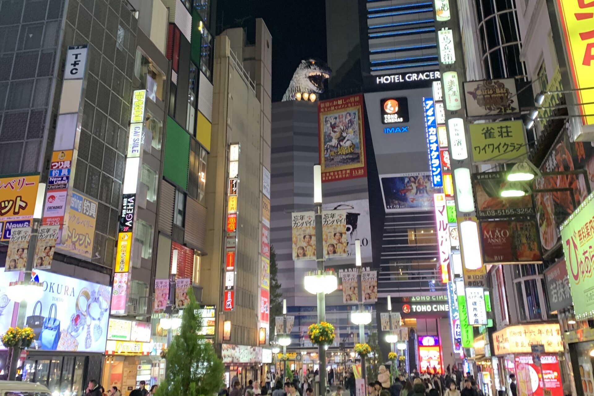 After passing through Omoide Yokocho (Memory Lane) and crossing the main street, continue on the right-hand side, going under the elevated railway tracks, and you’ll find yourself in Kabukicho (marked as B on the map). Keep going a bit further, and you’ll spot Godzilla, which has become a recent landmark in this area. The upper floors of this building are a hotel (Hotel Gracery Shinjuku), so there are rooms where you can get an even closer look at Godzilla. This street is lively both day and night, with many restaurants to choose from.
